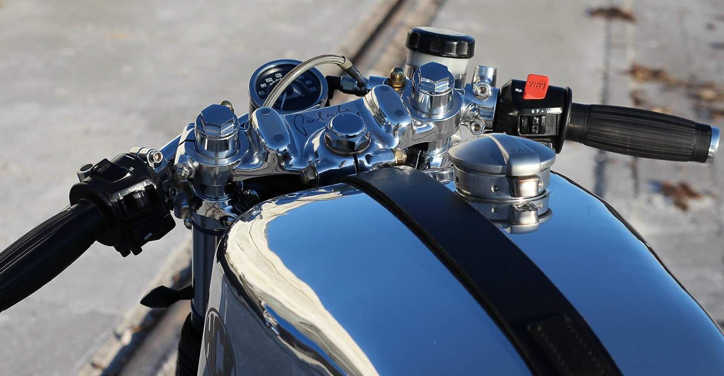 Anfangs hatte ich noch den CB 750-Tank verbaut, habe mir aber später nach Vorgabe von Friedhelm Lammers einen Alutank für meinen CB 550 Four Café Racer nachbauen lassen. Alle anderen Blechteile, Halter und auch die Sitzbank entstanden in Eigenregie. Bei den Stummellenkern wurde ich bei einer Honda XBR500 fündig.