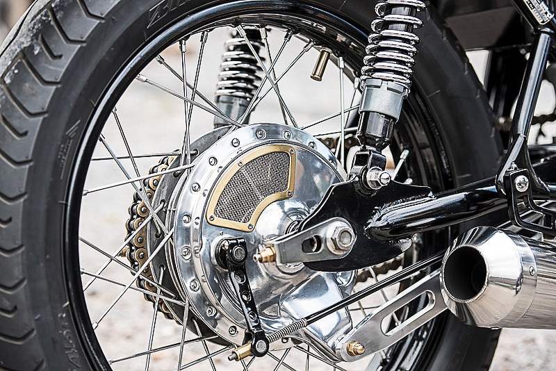 Die Telegabel wurde komplett überholt und hinten spendierte ich meinem CB 550 Four Café Racer neue Hagon Dämpfer. Der Rahmen benötigte nur partiell ein paar Anpassungen mit der Flex und bekam anschließend eine schützende Pulverbeschichtung. Die Felgen wurden ebenso gepulvert, die Naben poliert und alles mit neuen Chromspeichen verbunden. Frische Bridgestone-Reifen im Format 100/90-19 vorn und 120/80-18 hinten mit dem BT45 Profil runden die neue Komposition ab.