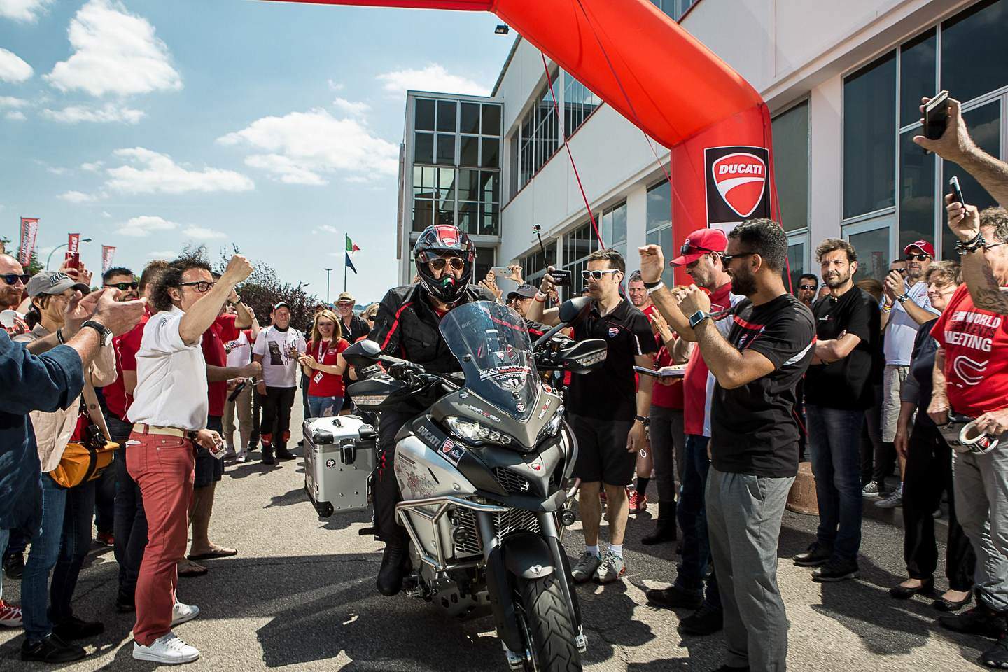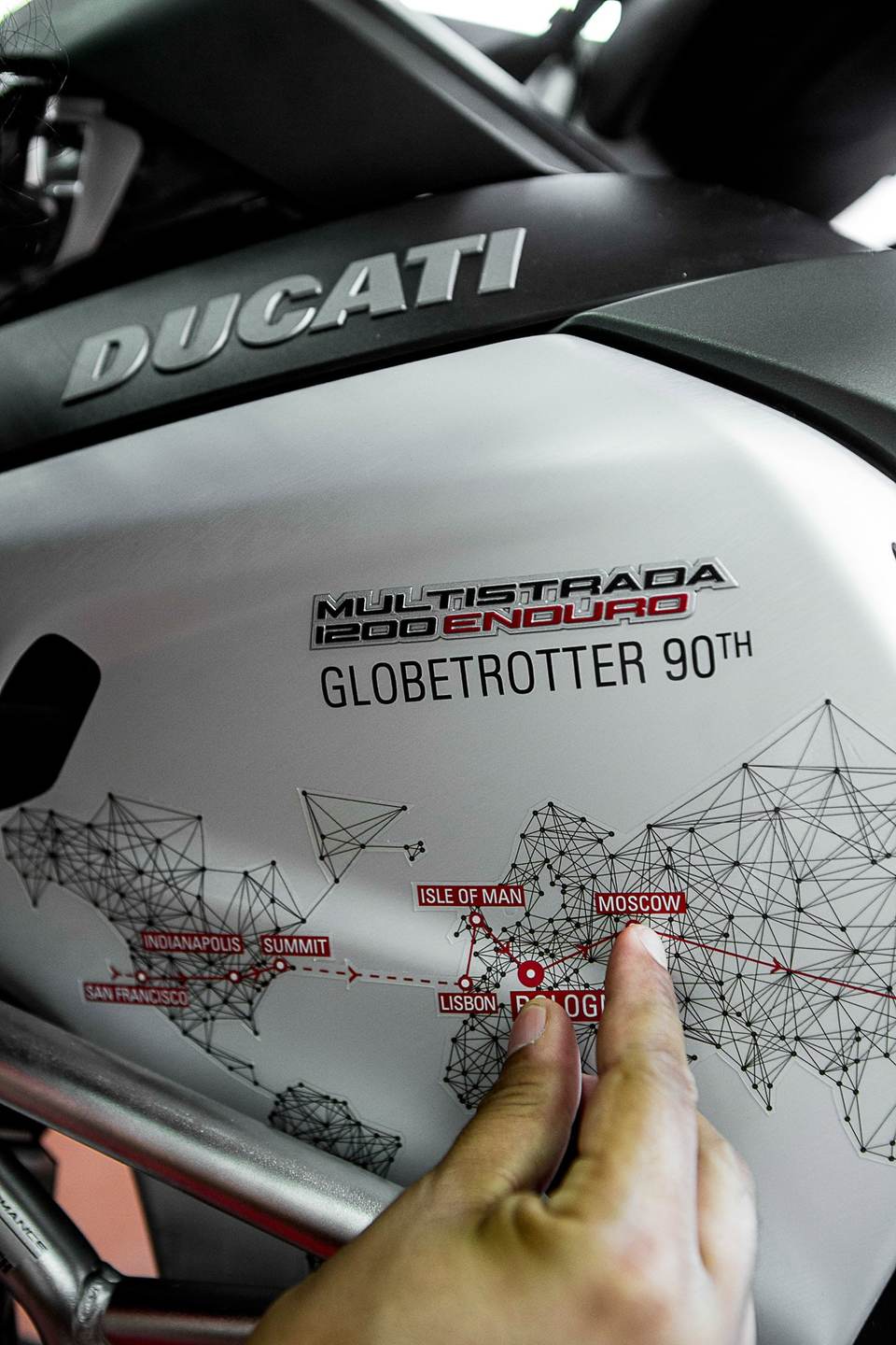 Die sieben, aus über 3.000 Bewerbern ausgewählten, Fahrer bewältigen auf einer Multistrada 1200 Enduro den 30.000 Kilometer langen „Globetrotter 90th“ genannten Staffellauf. Auf ihrer Reise „Globetrotter 90th“ tragen sie eine symbolische Fackel mit sich um den Planeten. Die Ducati-Piloten besuchen Orte, an denen die Traditionsmarke während ihres 90-jährigen Bestehens Geschichte geschrieben hat. Der letzte der sieben Globetrotter wird Mitte November 2016 nach Bologna in das Ducati-Werk zurückkehren.